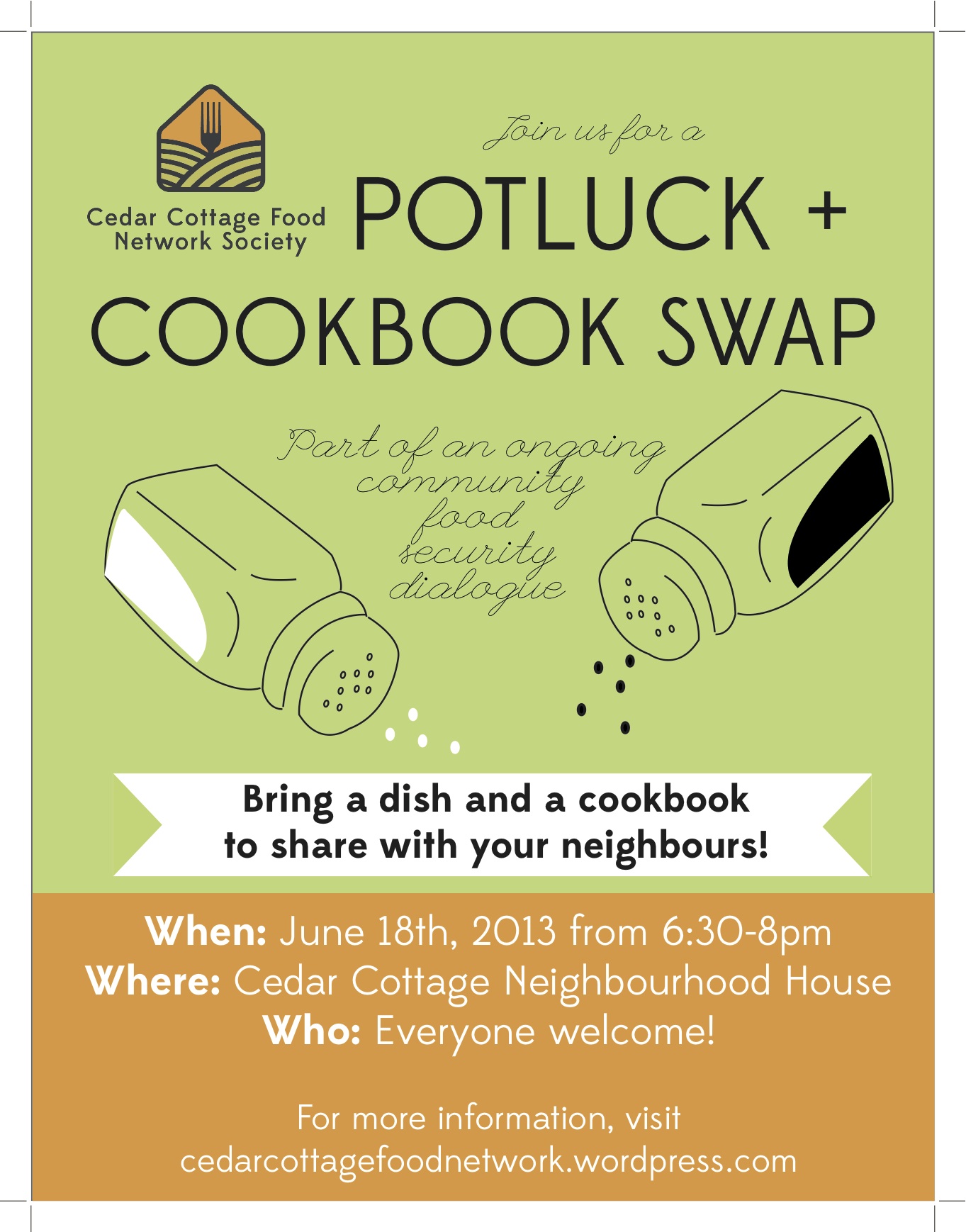 You’re invited to participate in a community food security meeting this coming Tuesday evening at the Cedar Cottage Neighbourhood House. Bring a dish to share with your neighbours as well as a cookbook to swap. We’ll chat about what’s going on in your neighbourhood and what opportunities there are to make food more accessible.