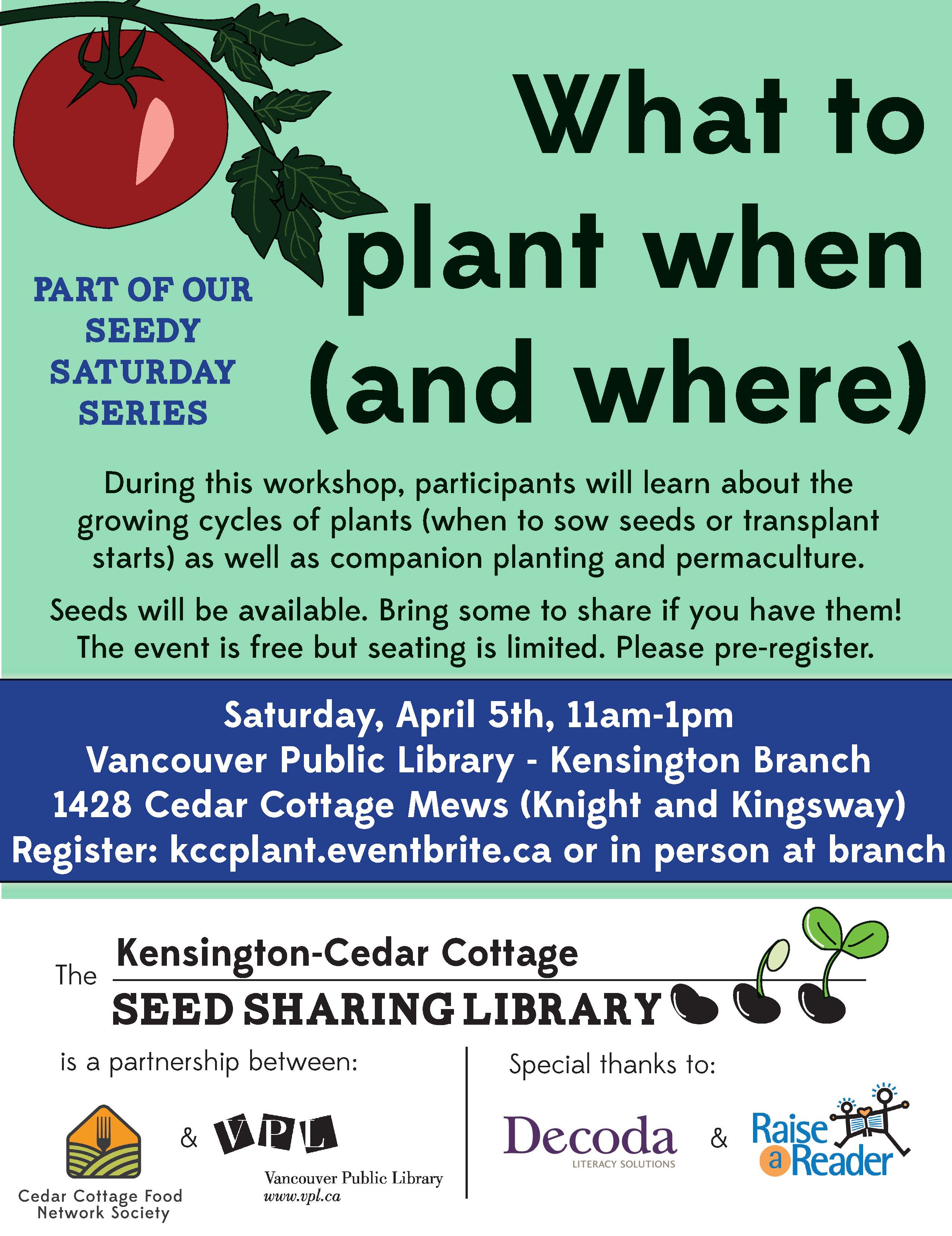 SeedySat0405On March 1st, the Kensington-Cedar Cottage Seed Sharing Library lent out its first seeds. Now, we’re ready to hold our next Seedy Saturday event: What to plant when (and where)!