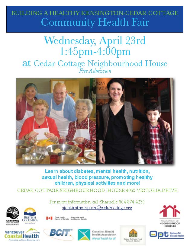 We are excited to have been asked to join the Community Health Fair at the Cedar Cottage Neighbourhood House on April 23rd! The event will go from 1:45-4:00pm and will include booths with information on family planning, mental health, nutrition, and other preventative health measures.