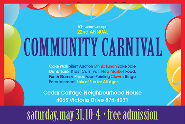 Cedar Cottage Neighbourhood House is hosting a community carnival on Saturday, May 31st from 10am-4pm. It is the 22nd annual event of this kind at the Neighbourhood House.