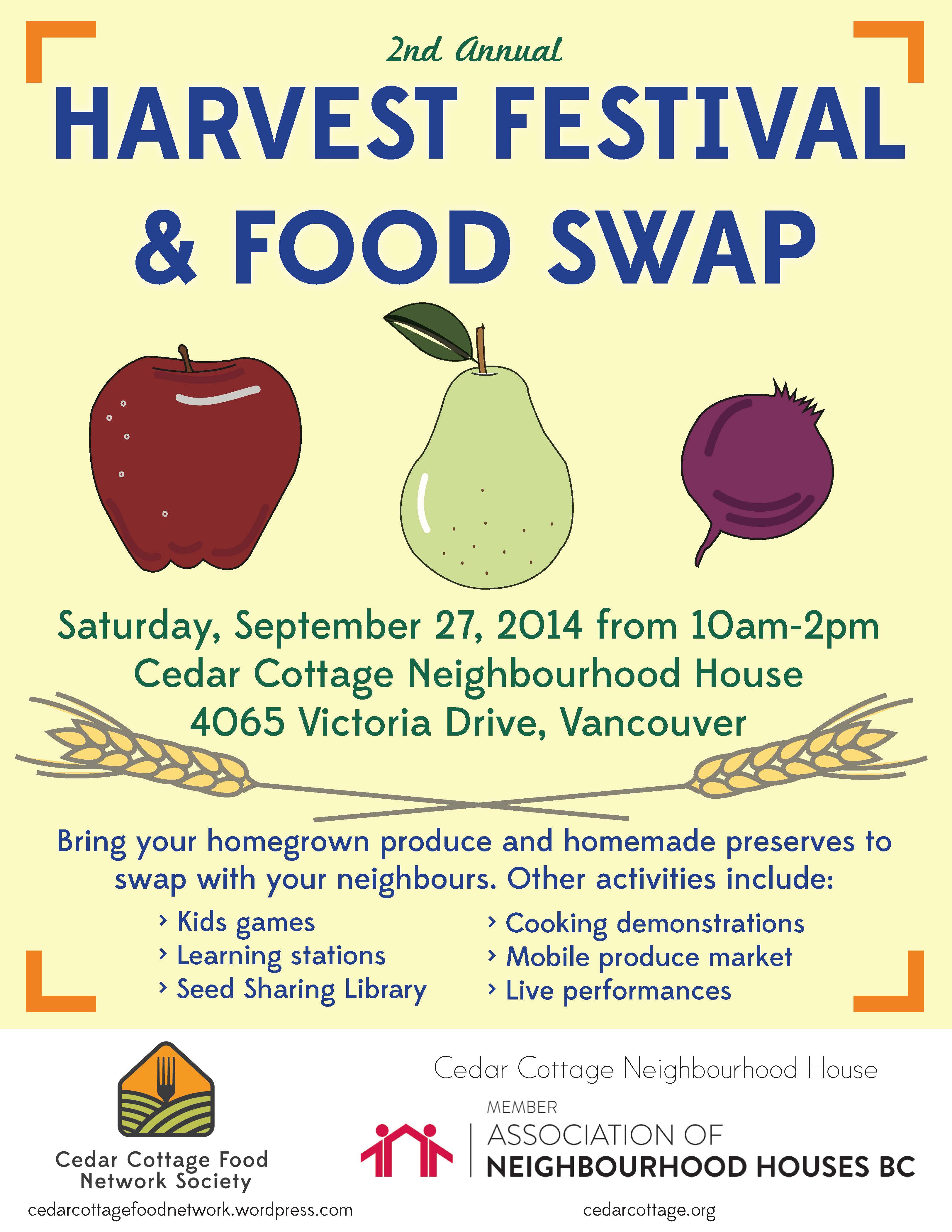It’s here again: the 2nd Annual Harvest Festival and Food Swap! We’ll be bringing in the new season in style down at Cedar Cottage Neighbourhood House on September 27th from 10am-2pm.