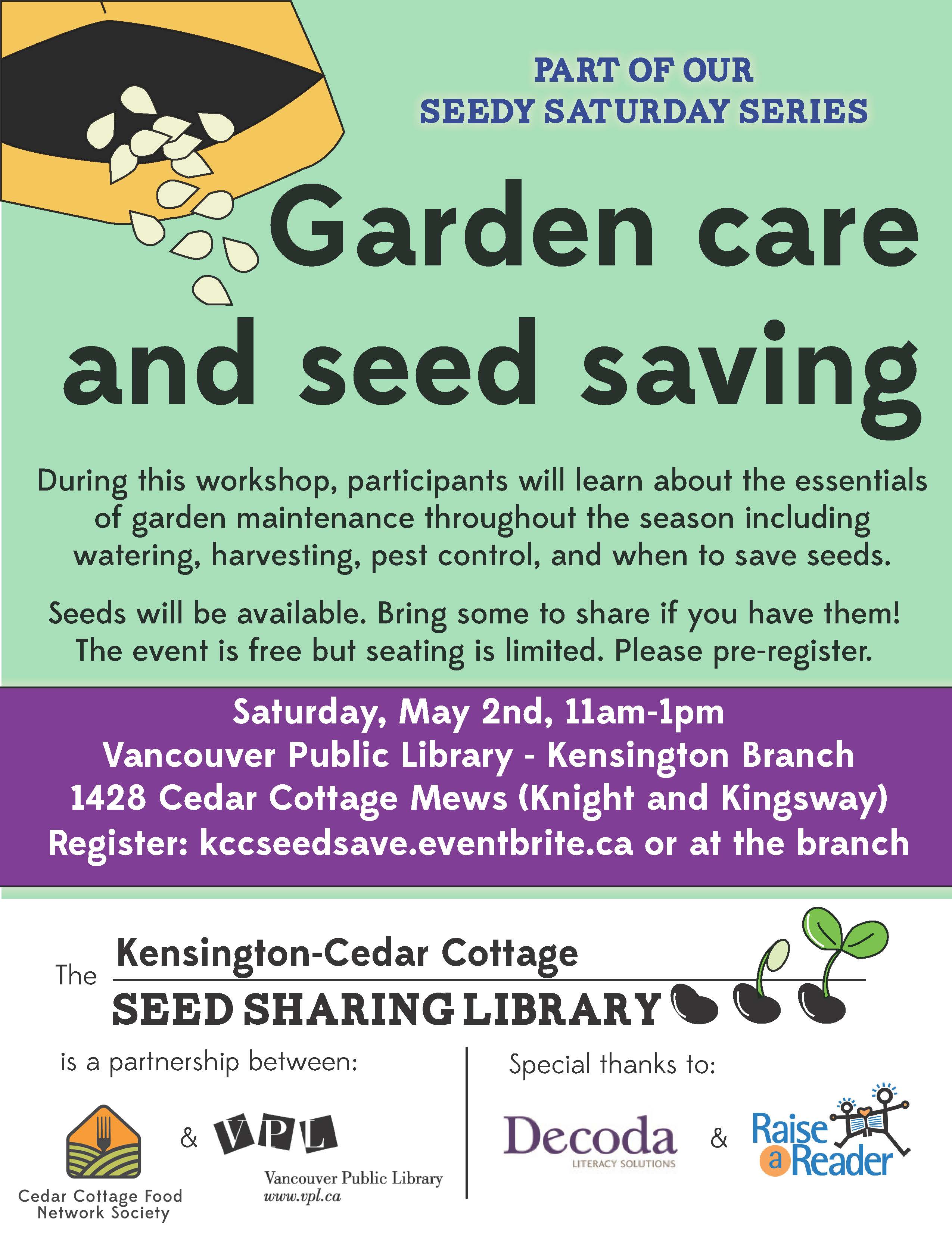 On May 2nd, 2015, the CCFN and Vancouver Public Library – Kensington are presenting a workshop on garden care and seed saving. During this workshop, participants will learn about the essentials of garden maintenance throughout the season including watering, harvesting, pest control, soil testing, and more! The instructor will also cover how and when to save seeds for next season (and to donate back to the seed library!).