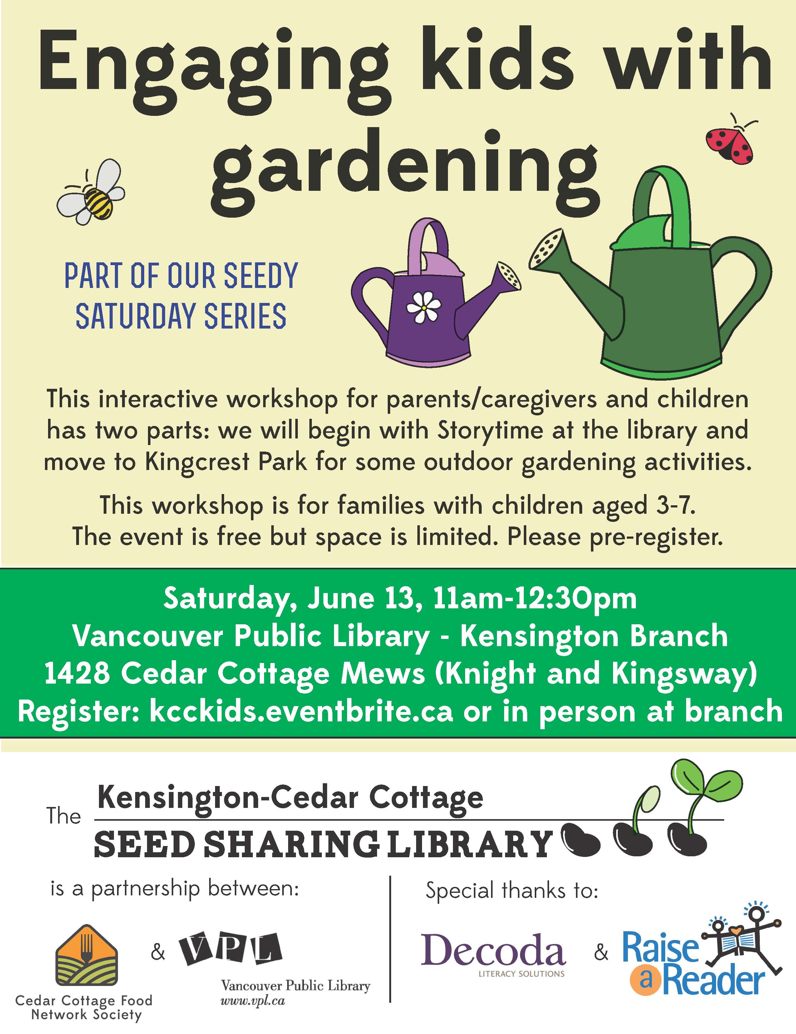 We have a very exciting new addition to our Seedy Saturday series this year: Engaging Kids with Gardening! This interactive workshop for parents/caregivers and children has two parts: