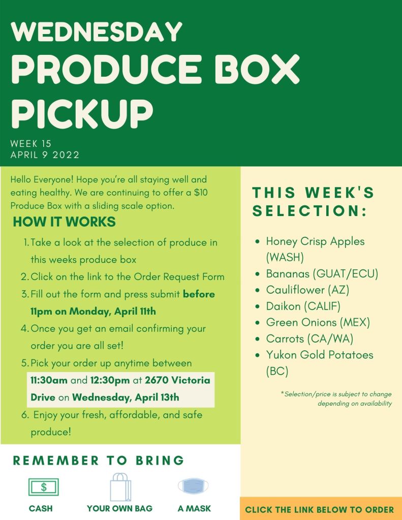 How our sliding scale payment works: The $10 box price is the wholesale price we pay for the food. However, we know that some of our shoppers cannot afford the $10 box price in these difficult times. A few generous supporters have made it possible that we are able to offer boxes at a subsidized price of $5. The $5 box price is for those of you who are struggling and cannot afford it otherwise. We are also offering some boxes for free. Please request a free box in the Order Request Form, if you cannot afford fresh veggies and fruit. We want to make sure we are able to support those in the community who wouldn’t otherwise have access to healthy food at this time.