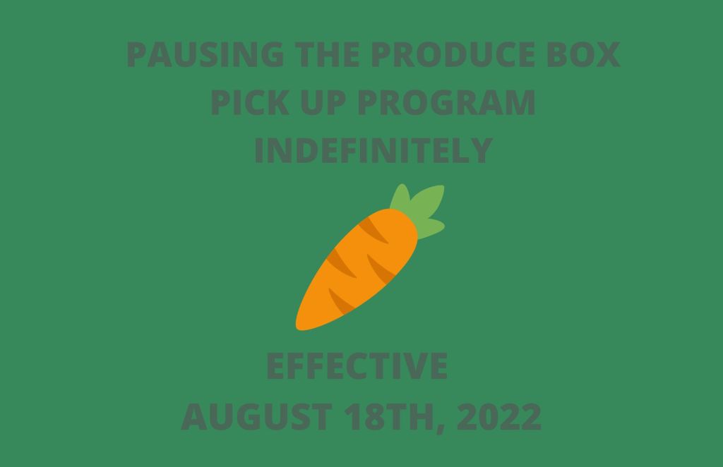 Due to restructuring of the organization, we regret to inform you that our produce box program will be suspended from August 18th, 2022 until further notice.