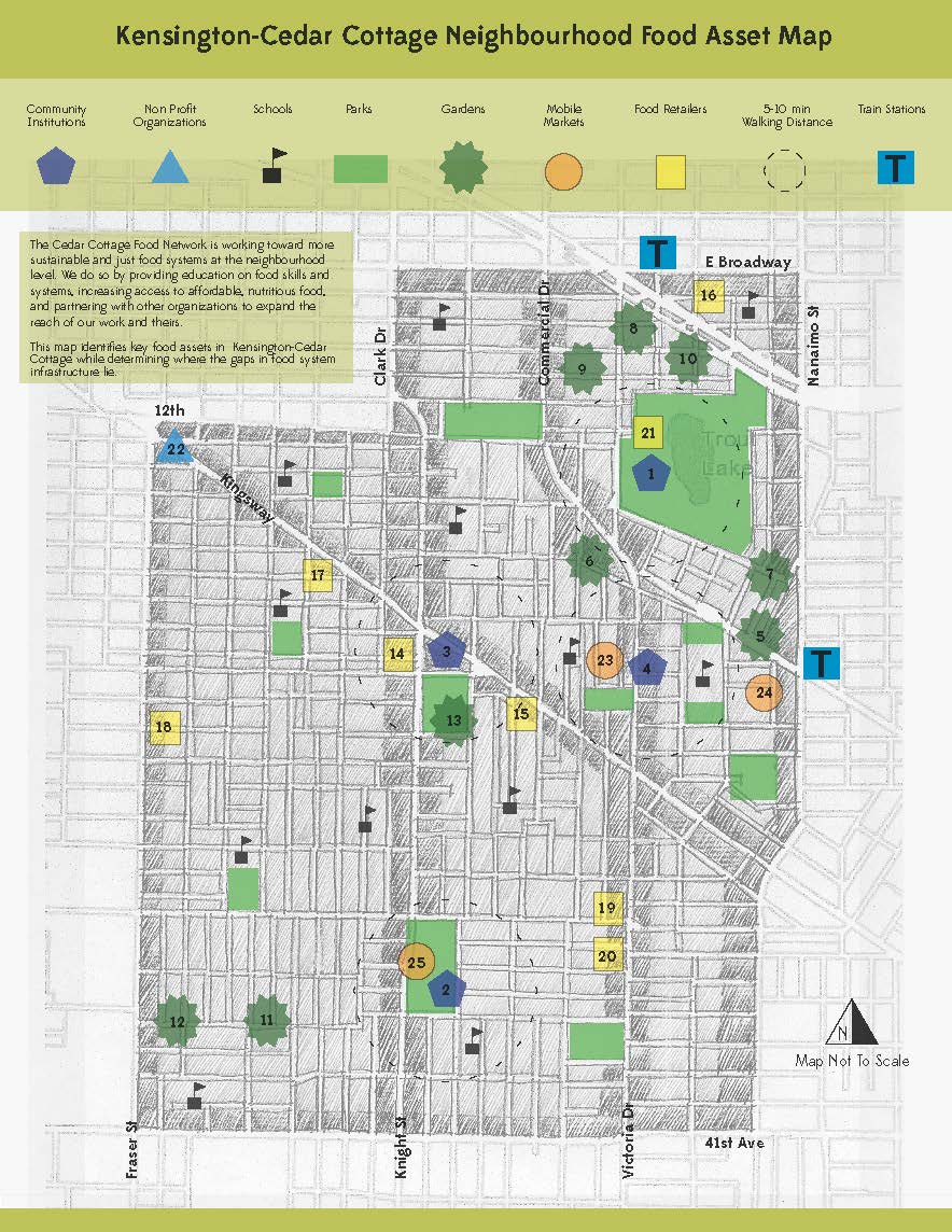 Cedar Cottage Food Network has worked with a designer to create the Kensington-Cedar Cottage Food Asset Map (click for full map). This map highlights food assets (grocery stores or markets, organizations offering food programs, gardens, etc.) and shows where there are gaps in food infrastructure. Part of our mandate is to help address these gaps either through supporting other organizations in their programs or starting our own.